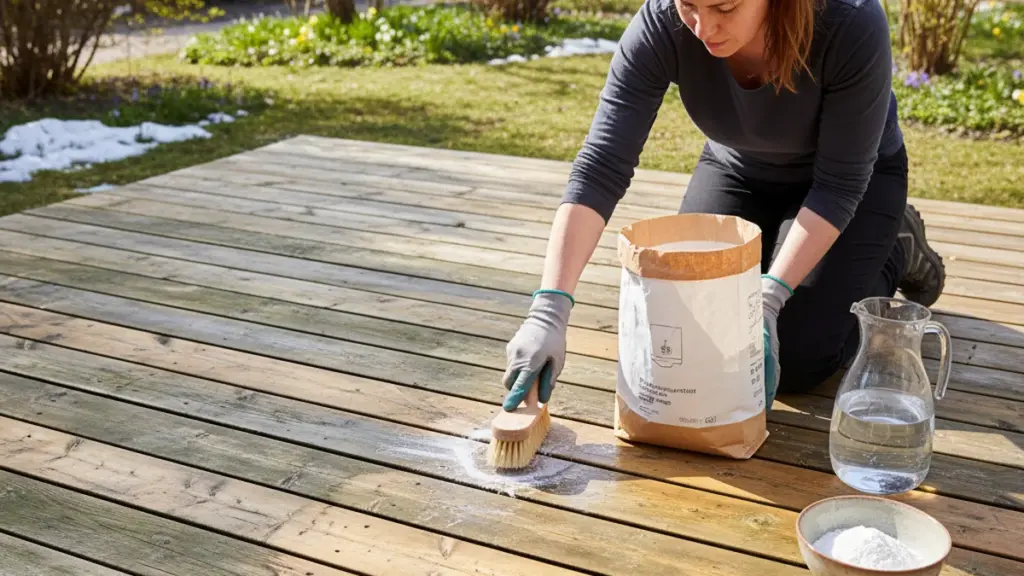 - Bereiten Sie die Wundermischung vor: Mischen Sie in einem Eimer warmes Wasser, einen großzügigen Schuss (etwa 200 ml) klaren Essig und einige Esslöffel gewöhnliches Natron. Die Mischung beginnt zu zischen und leicht zu schäumen – das ist das Zeichen dafür, dass sie bereit ist, hartnäckigen Schmutz zu lösen. Alternative: Bei besonders verschmutzten Terrassen können Sie auch echte, flüssige Schmierseife verwenden, deren natürliches Öl das Holz pflegt.