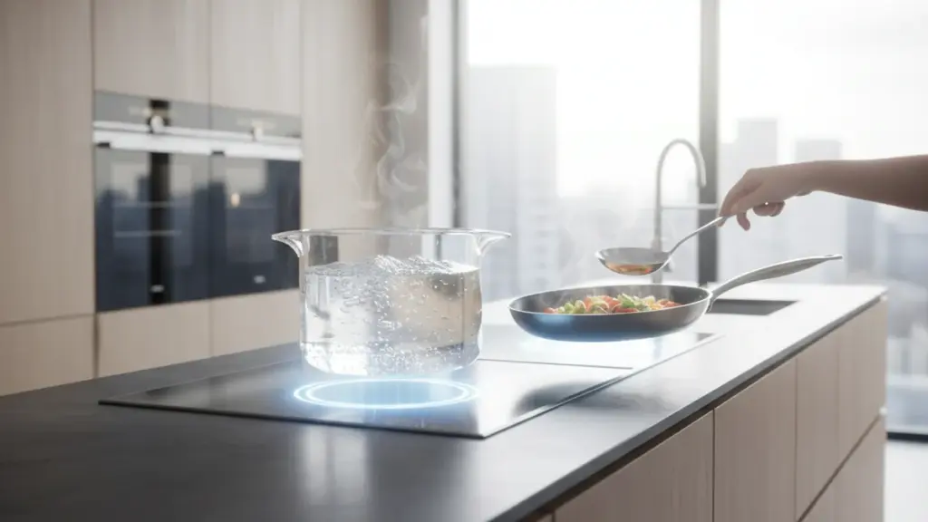 Hinzu kommt ein oft unterschätztes Problem: Wenn das Kochfeld nicht genutzt wird, blockiert es einen halben Quadratmeter wertvoller Arbeitsfläche. Hersteller und Entwickler suchten lange nach einer Lösung, die Geschwindigkeit bietet, aber ohne die physischen Einschränkungen bisheriger Technik.