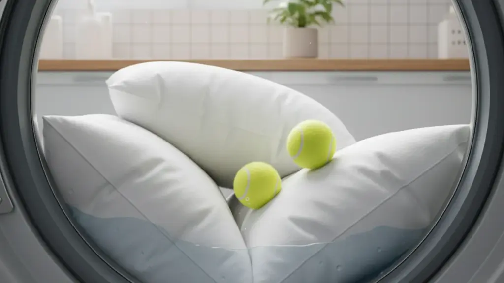Wenn man ein bis vier Tennisbälle beim Waschen von Kissen und Bettdecken hinzufügt, entsteht ein natürlicher „Klopfeffekt“. Während des Schleuderns wirbeln die Bälle kräftig in der Trommel herum und ahmen die altbewährte Methode nach, Textilien von Hand auszuklopfen. Dies lockert die Fasern auf und entfernt Schmutz deutlich effektiver.