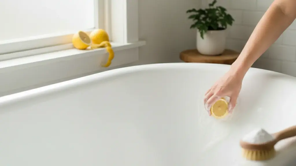 Nehmen Sie eine frische Zitrone und schneiden Sie diese in zwei Hälften. Reiben Sie damit gründlich alle verschmutzten Bereiche ab – besonders intensiv sollten Sie den Abflussbereich und die Wannenränder behandeln, wo sich Beläge am hartnäckigsten festsetzen.