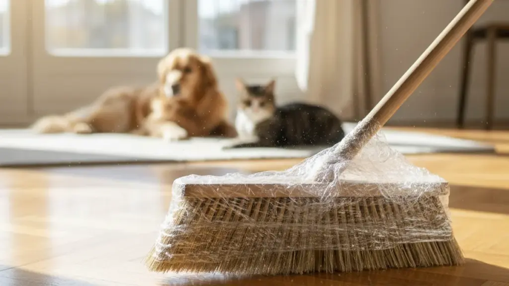 Der klassische Besen wirbelt hingegen den feinen Staub nur in die Luft, und Haare verfangen sich hartnäckig zwischen den Borsten. Profis aus der Reinigungsbranche und clevere Social-Media-Nutzer teilen jedoch ein Bild, das zunächst vollkommen absurd wirkt: ein gewöhnlicher Haushaltsbesen, umwickelt mit herkömmlicher Frischhaltefolie aus der Küche.