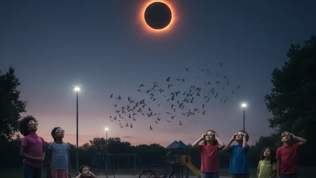 An diesem Datum gleitet der Schatten des Mondes quer über den Kontinent. Millionen von Menschen, verteilt entlang des Pfades der Totalität, werden kurzzeitig in eine Dunkelheit getaucht, die etwas zu lange andauert, um harmlos zu wirken. Wissenschaftliche Berichte dominieren die Gespräche; einige Biologen warnen davor, dass solch plötzliche Veränderungen der Lichtverhältnisse den circadianen Rhythmus stören, hormonelle Schwankungen verursachen und möglicherweise sogar unerklärliche elektromagnetische Reaktionen auslösen könnten.