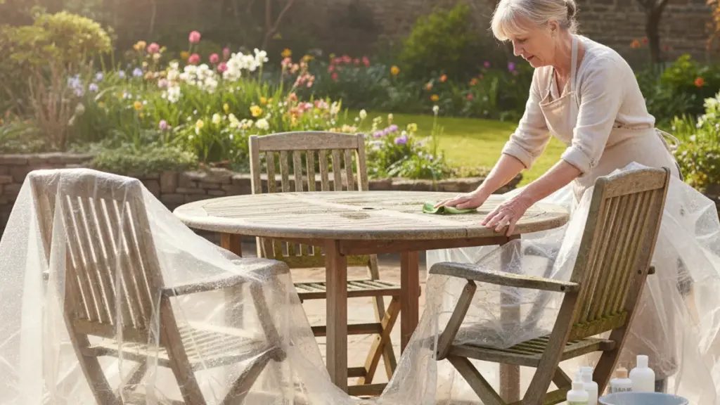 Das Sonnenlicht, das nach einem langen Winter hervorbricht, hilft dem Holz beim ordentlichen Trocknen und bietet Schimmelpilzen damit schlechte Bedingungen. Eine dünne Schicht Öl, Bienenwachs oder Holzpflegeöl schützt Holzoberflächen nach der Reinigung. Einfache Gewohnheiten wie das Abdecken der Möbel, trockene Lagerung und Reinigung vor und nach dem Winter begrenzen Schäden erheblich.