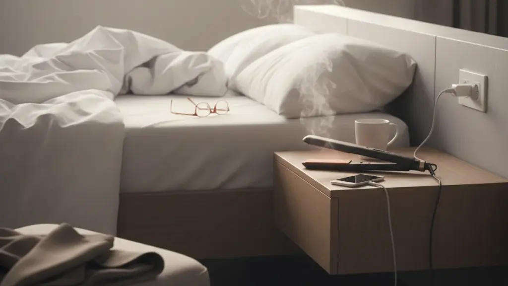 Anders als ein Bügeleisen, das schwer ist und meist sicher aufgestellt wird, landet ein leichtes Glätteisen in der Eile oft direkt auf dem Bett, der Bettdecke, einem Kunststoff-Schminktisch oder zwischen Kosmetikartikeln.