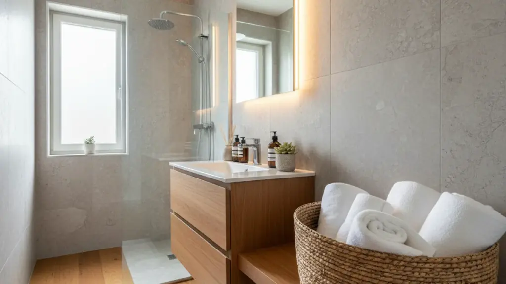 Viele versuchen, das Problem mit Saugnapfregalen an der Wand oder schmalen Metallwagen zwischen Toilette und Wand zu lösen. Doch solche Lösungen lassen den Raum oft nur noch unruhiger und beengter wirken.