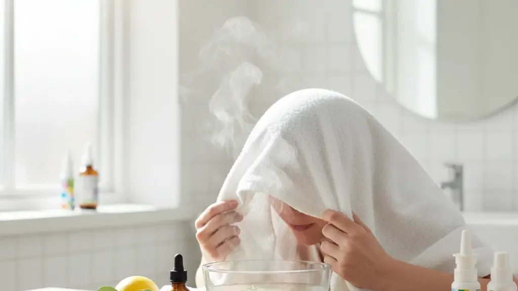 Das Rezept ist schlicht geblieben. Warmes – nicht kochendes – Wasser, eine gewöhnliche Schüssel, ein Geschirrtuch über Kopf und Schultern. Vorsichtig einatmen; langsam füllt sich der Brustkorb mit wohltuenden Dämpfen. Der Dampf erreicht die Schleimhaut direkt, hilft rasch beim Freimachen der Atemwege und unterstützt die natürliche Heilung.