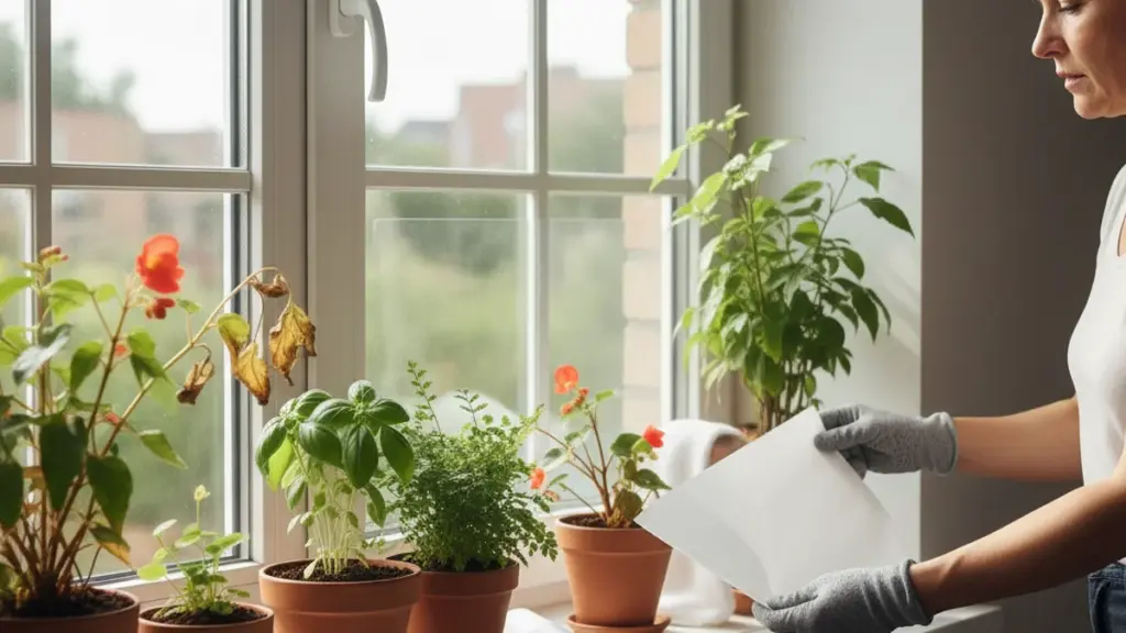 - Der Backpapier-Trick (Ideal für Setzlinge!): Nehmen Sie eine Rolle gewöhnliches weißes Backpapier. Schneiden Sie passende Streifen ab und befestigen Sie diese mit Malerkrepp leicht direkt auf der Fensterscheibe, genau hinter Ihren Setzlingen und Pflanzen. Backpapier filtert und streut das Sonnenlicht zu perfekt sanftem, weißem Streulicht, das den Pflanzen Energie liefert, ohne sie jemals zu verbrennen!