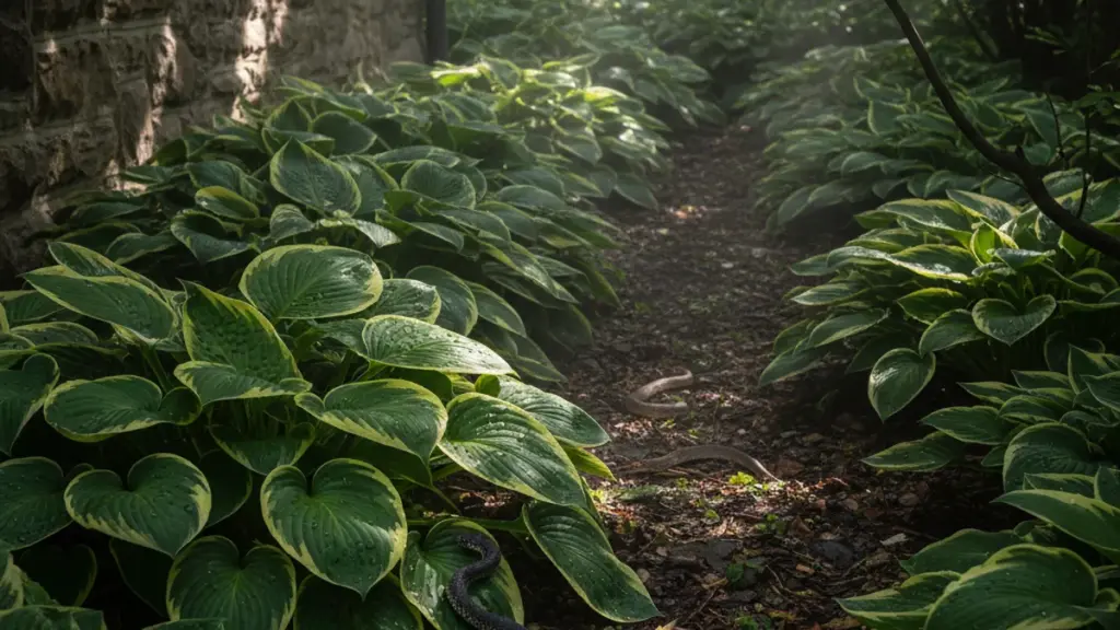 Es sind genau der Schatten und die anhaltende Feuchtigkeit unter den Blättern, die ein ganz anderes Publikum anziehen: Schlangen. Ihre Logik ist simpel. Hier finden sie kühle, feuchte und sichere Bedingungen vor. Zwischen Wurzeln und Laub leben ihre Beutetiere — Mäuse und andere kleine Nagetiere — geschützt vor Wind und praller Sonne. Funkien werden dadurch zu einer Art Willkommensmatte, einer direkten Einladung, unmittelbar neben der Hintertür.