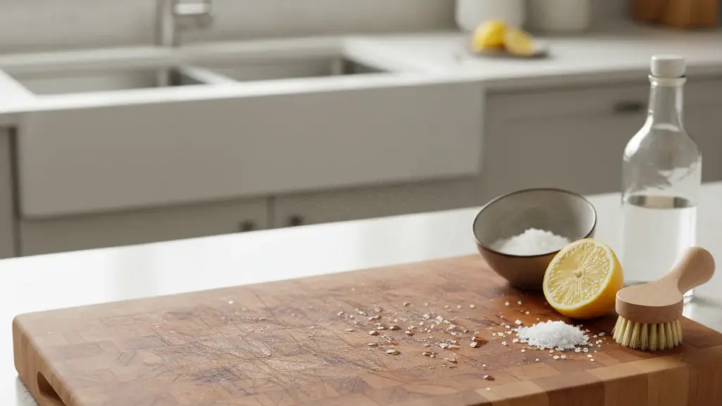 Schritt 3 – Einwirken lassen und abspülen: Reiben Sie die Paste besonders intensiv in die tiefsten Schnitte ein. Lassen Sie die Salz-Zitronen-Mischung etwa fünf bis zehn Minuten auf dem Brett einwirken. Spülen Sie das Brett anschließend mit heißem Wasser ab, trocknen Sie es sofort mit einem sauberen Handtuch und stellen Sie es aufrecht an einen luftigen Ort zum Trocknen.