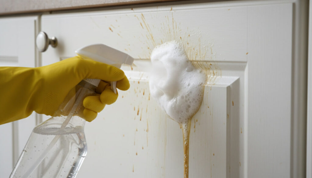 - Aufsprühen und WARTEN (die goldene Regel!): Dies ist der Schritt, bei dem 90 Prozent aller Menschen scheitern. Sprühe die warme Mischung großzügig auf die fettige Schranktür. Greife nicht zum Lappen! Lass die Lösung mindestens 5 bis 10 Minuten einwirken. Du wirst mit bloßem Auge beobachten, wie der weiße Schaum sich gelblich verfärbt, während er das alte Fett ablöst und der Schmutz langsam nach unten zu fließen beginnt.