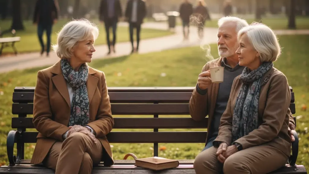 Eine Parkbank am Nachmittag. Ältere Menschen unterhalten sich leise miteinander, jedes Wort bedacht gewählt, als würden sie es kosten. Längst nicht alle aus der Vergangenheit sitzen neben ihnen — einige fehlen, ohne Erklärung. Das Schweigen zwischen den vertrauten Stimmen erzählt von Entscheidungen, die weniger sichtbar, aber umso kraftvoller sind. Nicht jeder, der verschwindet, hinterlässt eine Lücke. Manchmal bringt es Freiheit.