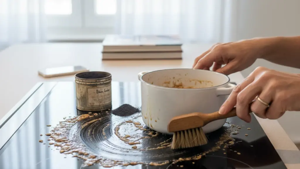 Eine neue Küche bedeutet für die meisten Haushalte die größte Investition überhaupt. Als die 44-jährige Sara endlich ihren Traum verwirklichte und ein glänzendes schwarzes Induktionskochfeld in ihrer neuen Küche installieren ließ, schwor sie sich, diese makellose Oberfläche für immer zu bewahren. Doch der Alltag hatte andere Pläne. Ein einziger Moment der Unachtsamkeit – ein kurzes Telefonat – und schon kochte der zuckerhaltige Haferbrei über. Das Ergebnis war verheerend: Brennend heißer Zucker und Stärke brannten sich innerhalb von Sekunden in die Glasoberfläche ein und bildeten eine steinharte, schwarze Kruste. In ihrer Panik beging Sara genau den Fehler, vor dem alle Hersteller eindringlich warnen. Sie griff zum rauen Scheuerschwamm. Als das Kochfeld ruiniert und voller Kratzer war, rettete nur ein verzweifelter Anruf bei ihrer Schwiegermutter und ein „kostenloses Abfallprodukt“ aus dem Kaminofen den Schaden in Höhe von tausenden Euro.