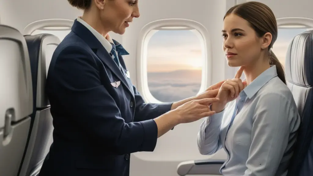 Während des Fluges schaut sie regelmäßig vorbei, stellt kurze Fragen, bringt Wasser und macht kleine Scherze. Durch diese wiederkehrende Präsenz entsteht ein Gefühl von Fürsorge statt Hilflosigkeit.